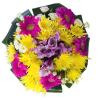 Состав: 5 гербер цвета фуксии, 5 желтых кустовых хризантем, 5 кремовых кустовых роз, 3 альстрамерии, 11 листьев аспидистры.