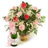 Состав: розовые розы , белые гвоздики , кустовые белые хризантемы , папоротник , зелень, корзина, оазис + шампанское.