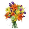 Состав: 5 азиатских лилий, 9 желтых одиночных хризантем, 3 белые одиночные хризантемы, 11 веток статицы, папоротник.