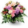 Состав: 7 розовых роз, 7 розовых гвоздик, 5 кустовых сиреневых хризантем, 4 альстрамерии, 3 веточки гиперикума, 8 веток папоротника