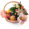 Состав: 1 лилия, 7 розовых роз, папоротник. Фрукты: ветка винограда, ветка бананов, 1 яблоко, 1 апельсин, бутылка шампанского, корзина.