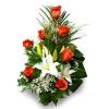 Состав: 7 оранжевых роз, 2 ветки лилии (с 5 бутонами), берграс, аспарагус умбелатус, 2 гипсофилы, 3 листа аспидистры, 3 папоротника, 1 лист робеллини.