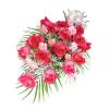 Состав: розовые и красные розы, розовые герберы, зелень, оформление.